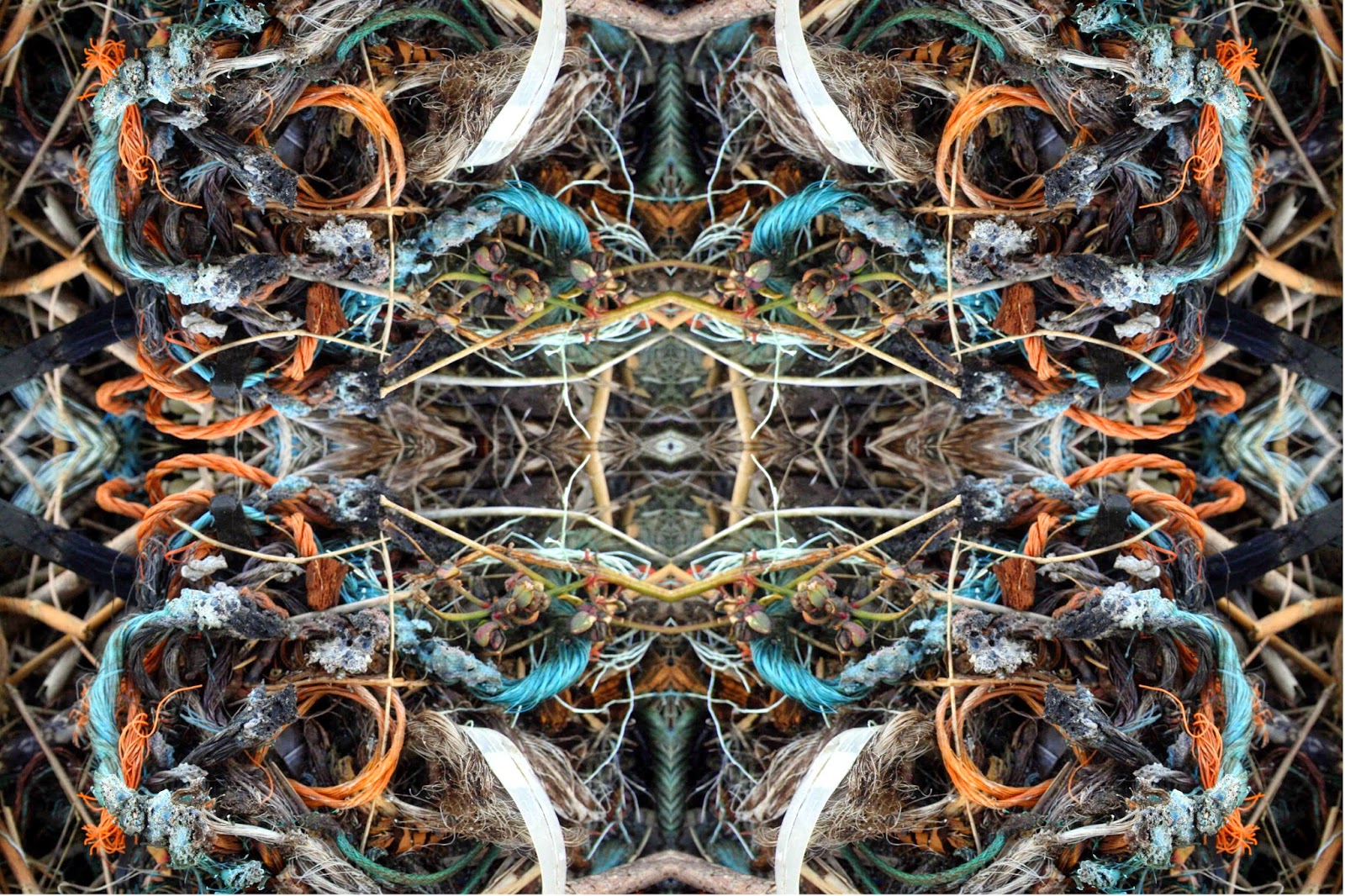 tape are suspended in a geometric wooden framework. The tape is in colours of rust, dark brown